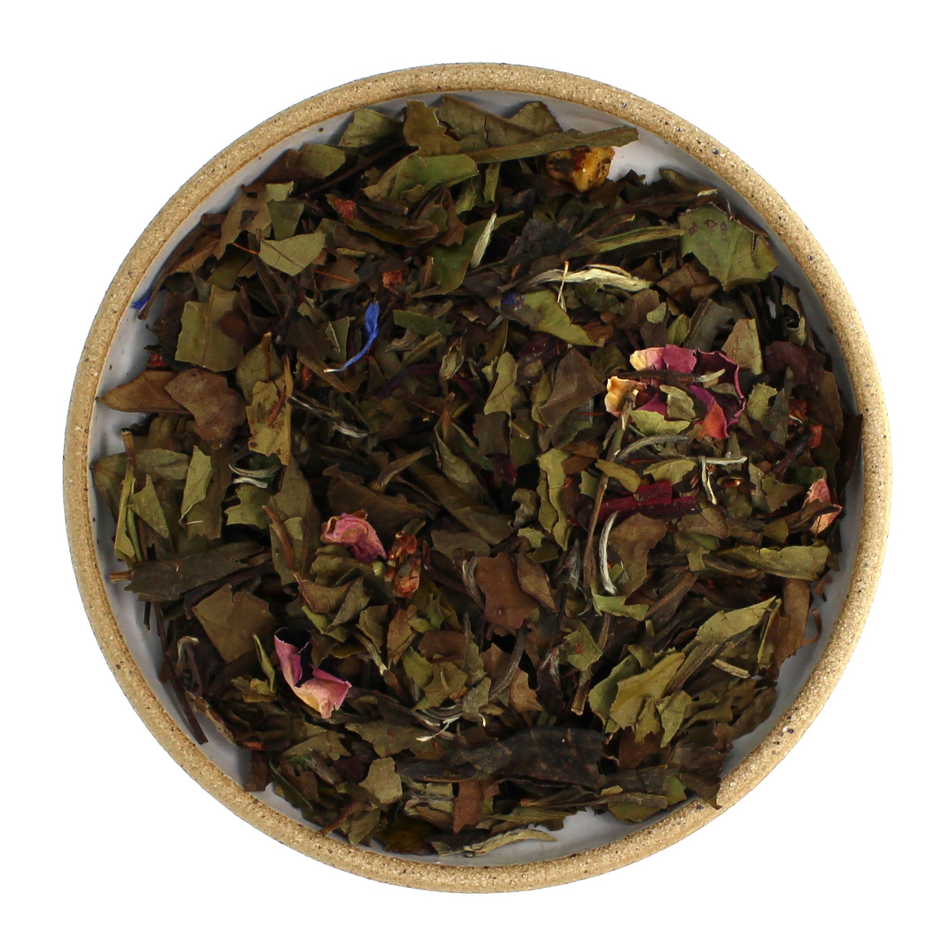 white tea, red rooibos, natural flavors, apple, freeze-dried blueberry, hibiscus*, freeze-dried strawberry, rose, blue cornflower