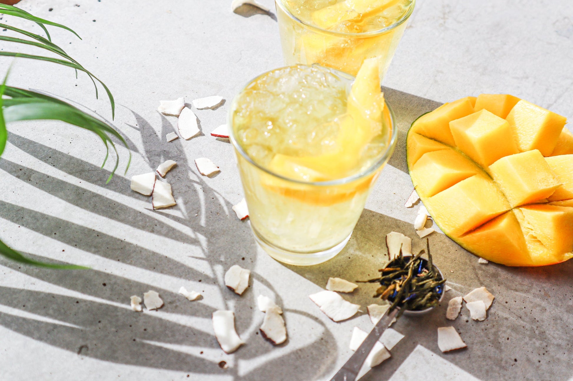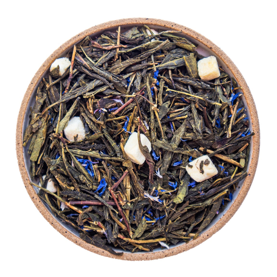 green tea, natural flavors, freeze-dried mango, blue cornflower