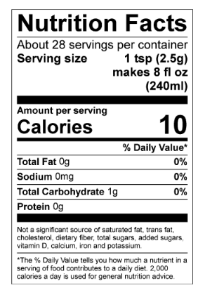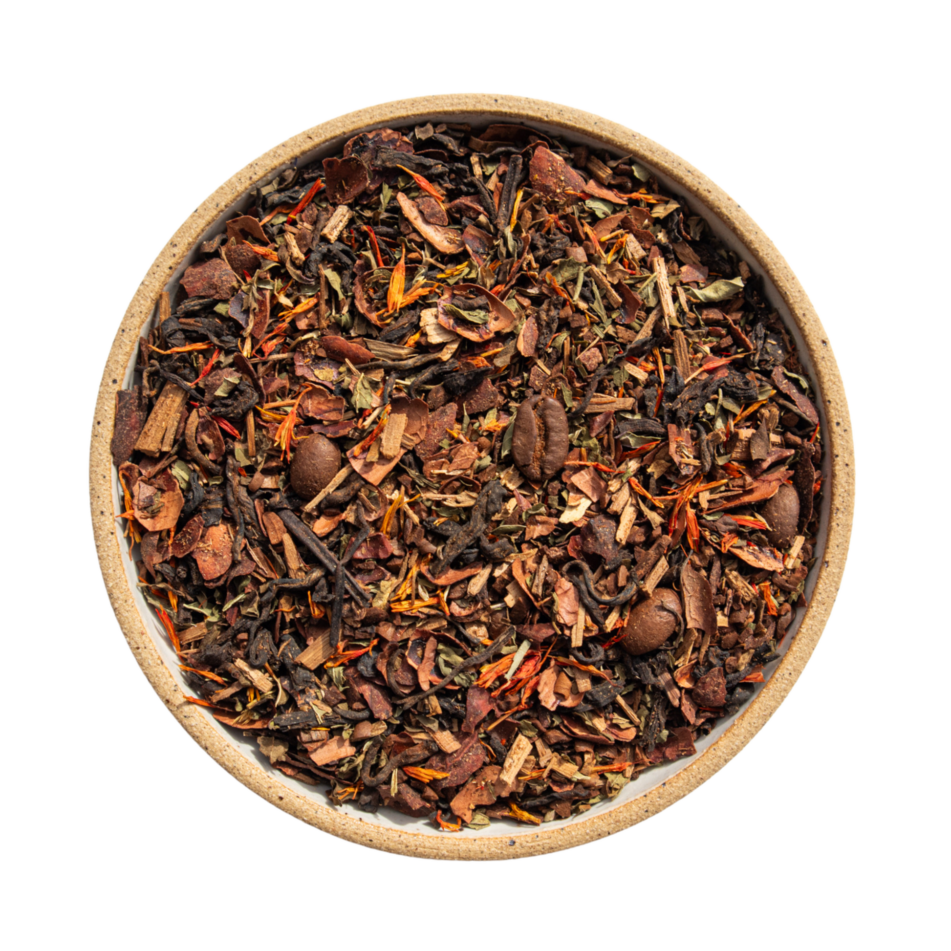 roasted coffee, pu erh tea, roasted oak wood, roasted cacao shell, peppermint, natural flavors, safflower